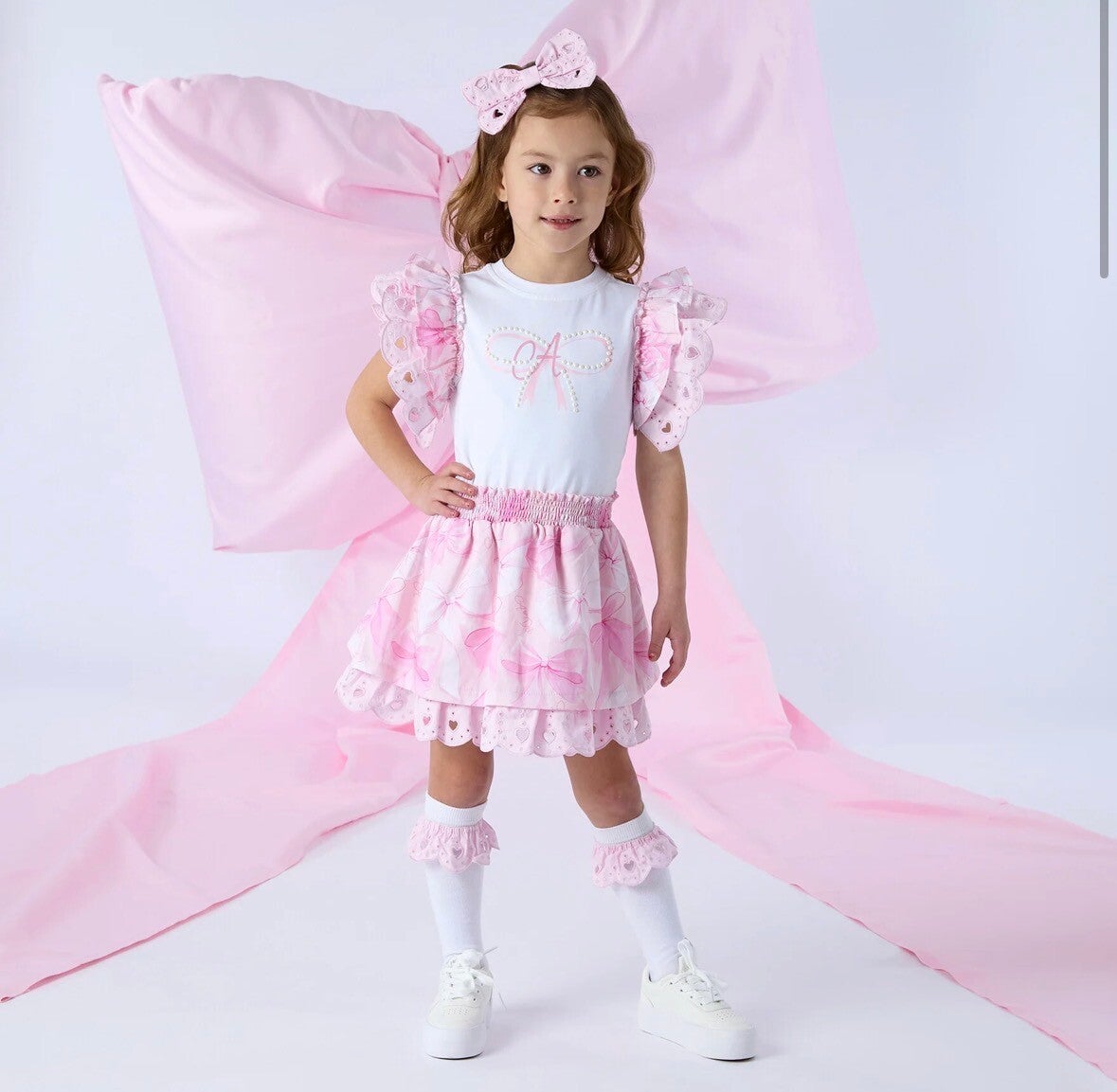 Deze roze meisjes jurk is een elegante en feestelijke keuze voor speciale momenten. De jurk heeft opvallende ruffle mouwen met verfijnde details en een speelse all-over print in zachte roze tinten.