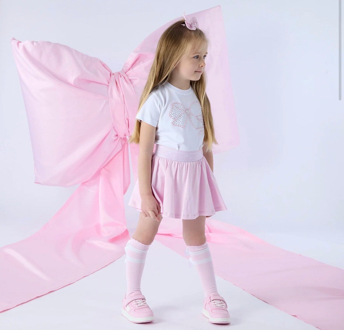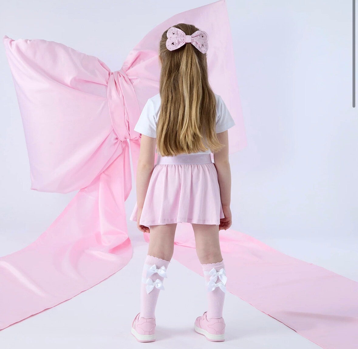 Deze roze meisjes set combineert stijl en comfort in één outfit. De set bestaat uit een T-shirt met strikdetail en een rokje met ingebouwd broekje (skort), waardoor je kind vrij kan bewegen zonder zorgen.
