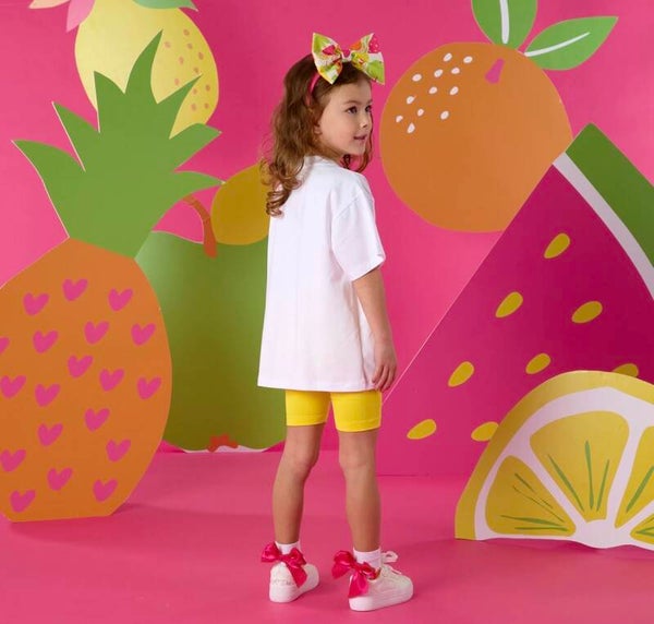 Deze vrolijke meisjes set bestaat uit een oversized T-shirt met kleurrijke fruitprint en een bijpassende short. De frisse kleuren en speelse print geven deze outfit een echte zomerse uitstraling.